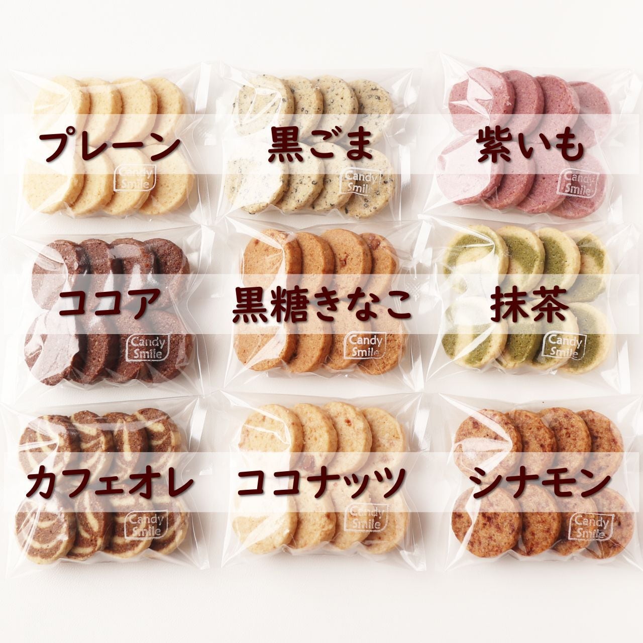プレーン、ココア、黒ごま、黒糖きなこ、紫いも、抹茶、カフェオレ、ココナッツ、シナモン(各1袋)