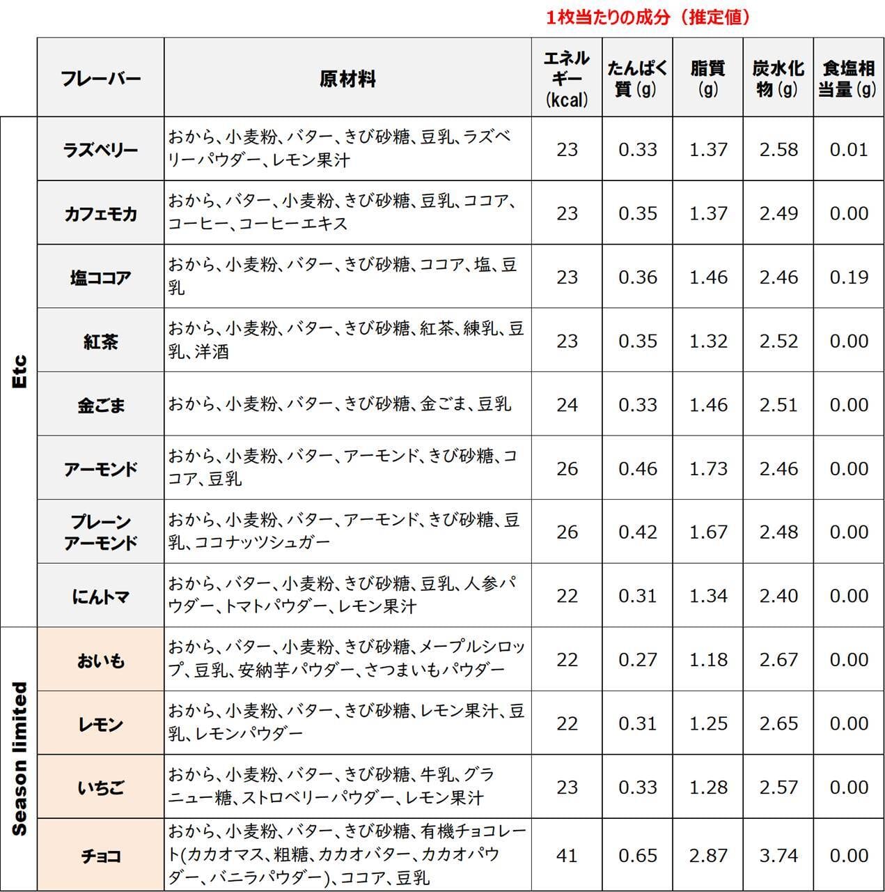 ・カフェオレ:おから、小麦粉、バター、きび砂糖、コーヒー、コーヒーエキス、豆乳
