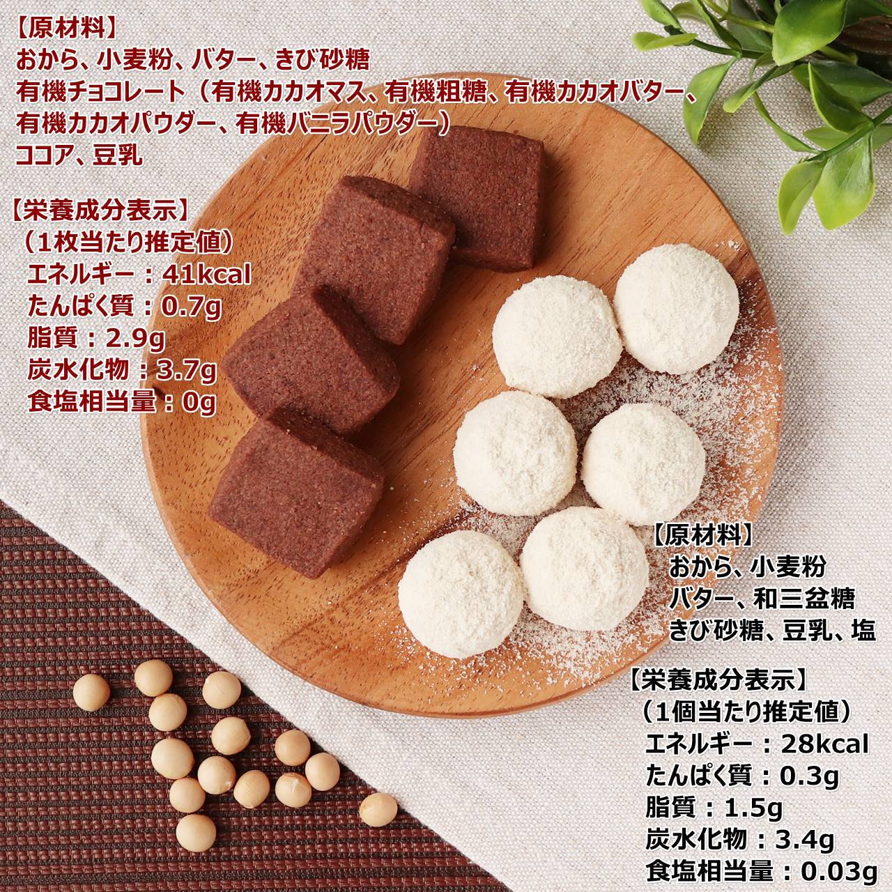 ・チョコ:おから、小麦粉、バター、きび砂糖、有機チョコレート(有機カカオマス、有機粗糖、有機カカオバター、有機カカオパウダー、有機バニラパウダー)、ココア、豆乳