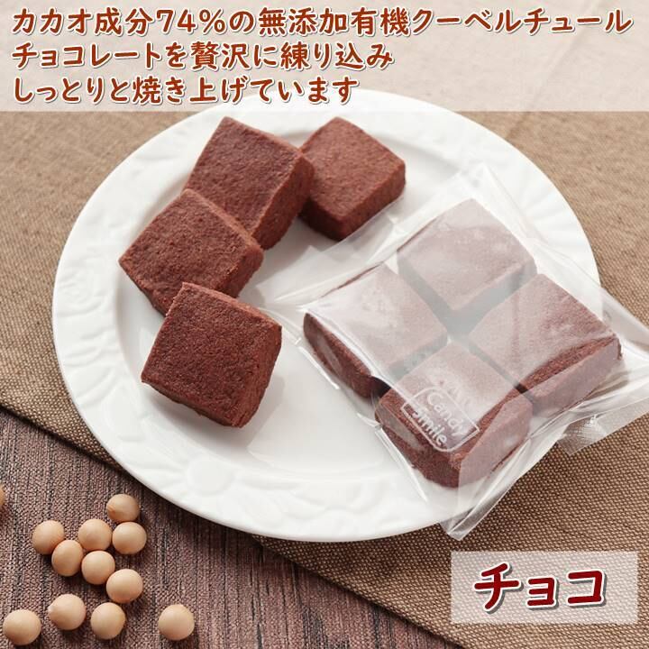 ・チョコ:おから、小麦粉、バター、きび砂糖、有機チョコレート(有機カカオマス、有機粗糖、有機カカオバター、有機カカオパウダー、有機バニラパウダー)、ココア、豆乳